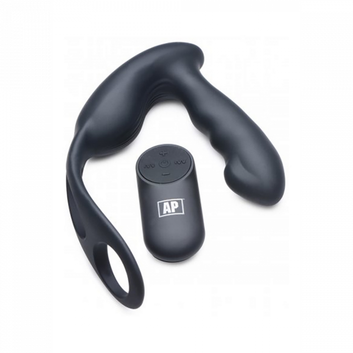 Dual Vibrating Remote Rotating Head Silicone Prostate Stimulator with Cock and Ball Ring - Black