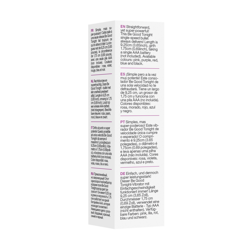 Rechtdoorzee en superkrachtig. Deze Be Good Tonight – bullet met één snelheid presteert altijd. Lengte is 9,3 cm (3,7 inch), omvang is 1,8cm (0,7 inch). Loopt op een enkele AAA-batterij(niet inbegrepen). Beschikbare kleuren: roze, paars,rood, blauw en zwart.