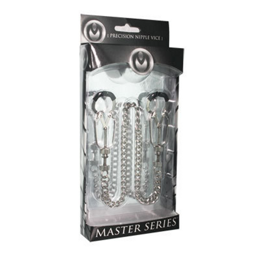 De Bauhaus Nipple Vice is ontworpen voor precisie en kracht en komt naar u toe met twee klemmen die kunnen worden aangepast aan het gewenste niveau van strakheid met de stelschroeven aan de basis. De tips zijn bedekt met zacht TPR met de toevoeging van een delicate curve helemaal aan het einde die helpt bij het vastgrijpen van de huid van uw onderwerp. Het einde van dit indrukwekkende stuk is de toevoeging van een 12-inch verbindingsketting die er zo aanlokkelijk uitziet als hij aan de tepels van je speeltje hangt.