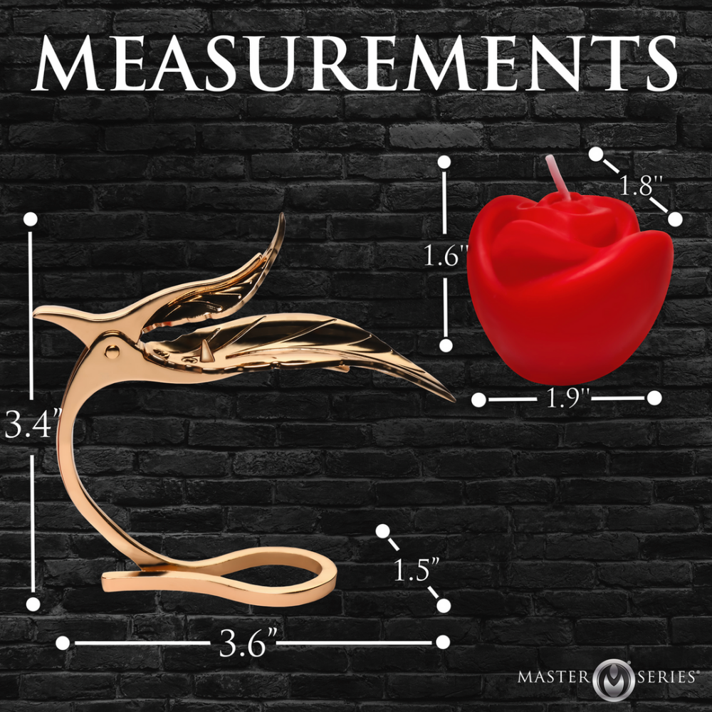This elegant rose candle holder has golden leaves and pins that hold the candle in place. As the wax melts, the wax pools and can be poured off the golden leaf for a gorgeous display that pleases the eyes before it stimulates the senses! Made out of a nickel-free, zinc alloy, it is designed to handle the hot temperatures of the candle as it burns. Enjoy the red rose that this holder comes with and place it right on the pin so it looks like it is blooming from a golden stem! The soy candle has a low melting point and is kinder on the skin than hotter burning candles. When this one runs out, get a replacement by buying more Burning Passion rose candles (AH229). The soy candles are easy to clean up and don’t stain. Play safely and lay down a towel each time to catch drips. There are many ways to enjoy wax play. Take a class to find out how to have fun and stay safe! If you’re new to wax play, set up a splash zone and lay down a towel or tarp to protect against wax spills. Test it on your arm or thigh first before trying it on your partner. Start high up and then get closer as you test out temperature and technique. Start by holding the candle 3 feet away from the body to drip wax. Blow out flame before pouring to reduce splashing. Layer the wax over the same spot to increase the intensity. Rub your hand over the wax drops in order to disperse heat. Measurements: Holder: 3.4 inches Height x 3.6 inches Width x 1. inches Depth. Candle: 1.6 inches Height x 1.9 inches Width x 1.8 inches Depth. Burn time: Approx. 1 hour. Materials: Candle: Soy wax, melting temp. 100-107˚ F (38-42˚ C). Holder: Zinc alloy.