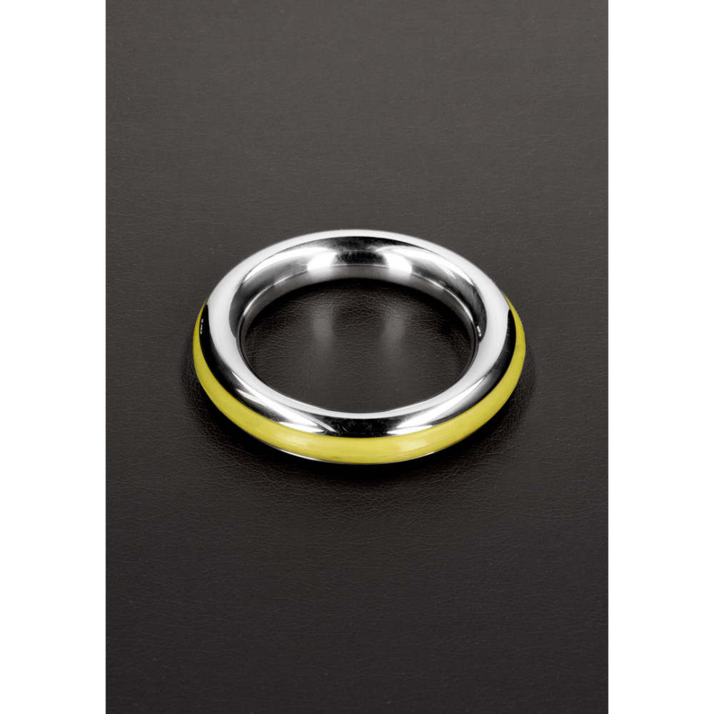 Made from Stainless Steel, this cockring is designed with comfort and style in mind The Cockring has Inlay Silicon Rubber Rings. In the colors: Red, Black, Blue and Yellow. This ring will help prolong your erection and add some flare at the same time.