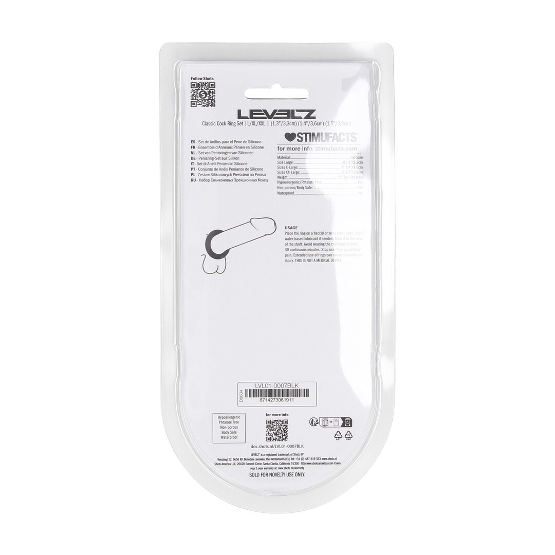 Verbeter je spel met dit essentiële trio uit de LEVELZ-collectie. Deze niet-vibrerende set bevat drie lichaamveilige siliconen cockringen in groot, extra groot, XXL en perfect voor schacht, penis en ballen, of gestapeld gebruik. Elke ring biedt een andere pasvorm en gevoel, zodat je je ervaring kunt aanpassen. Verpakt in een stijlvolle, verkoopbare clamshell voor gemakkelijke weergave en opslag.