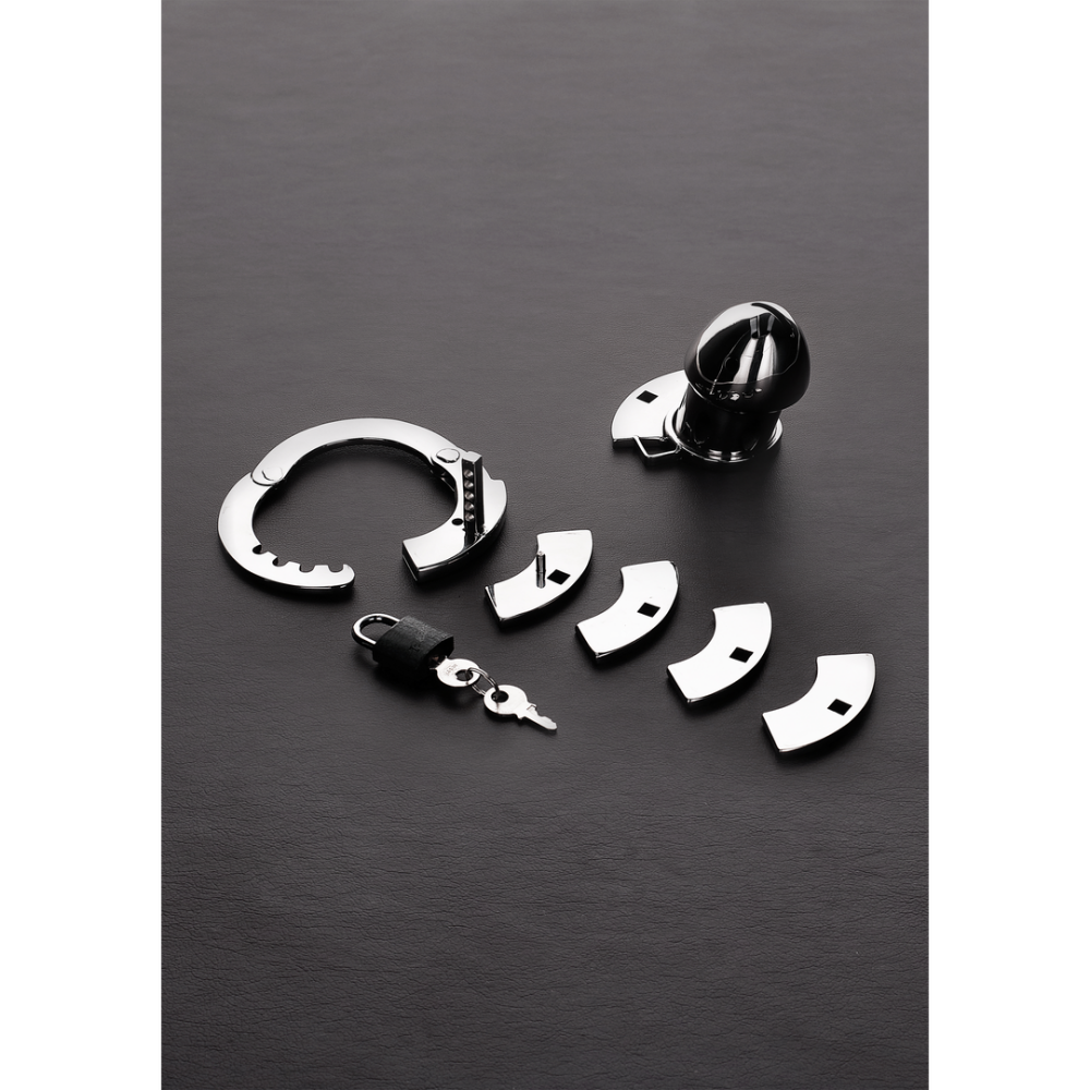 Lock up your mans cock and balls in this fully adjustable chastity cage! With a cuff-like design, the base ring of this device accommodates 4 different sizes. Lock the ring in place with the pin-in-hole plate system to trap his balls in the confines of that stainless steel ring. Meanwhile, his flaccid shaft will be stuck in the small metal cage with no escape! Three spacers allow you to adjust the cage to fit his length. Lock him up and watch him struggle for as long as you want! This device is breathable and includes a hole for him to urinate through for long-term use. Cage Length: 70mm. The postioning of the spacers between cage and base ring allows for further adjustment up to a further 20mm in or out. Ring Sizes: Adjustable from 40mm/45mm/ 50mm/55mm
