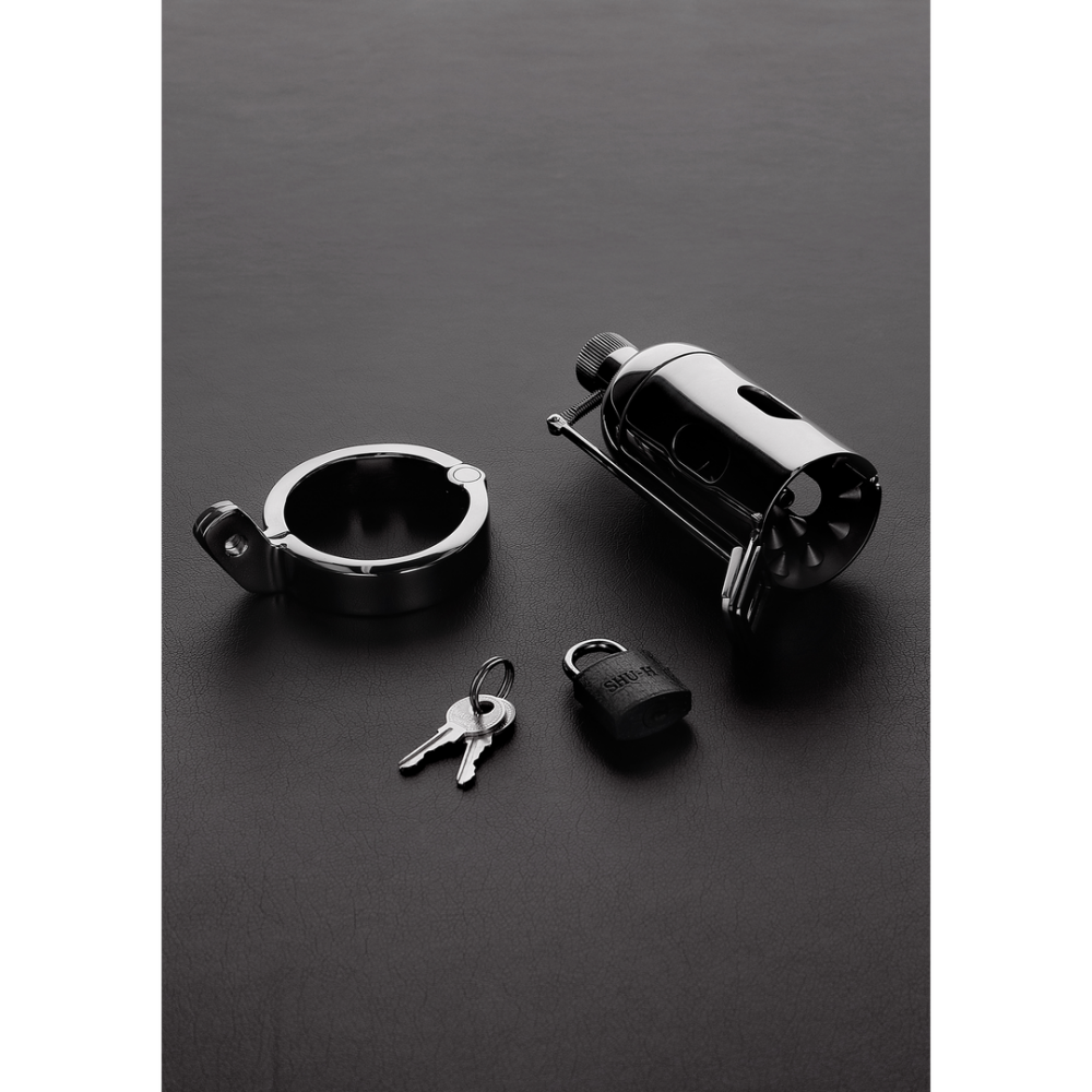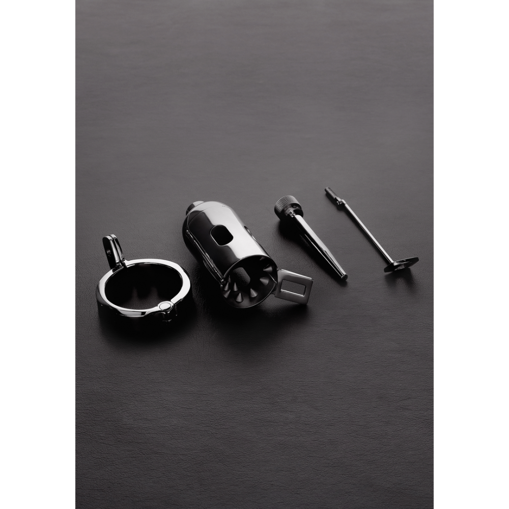 This chastity device is much more advanced version of the classic KTB chastity device, which effectively prevents erection. It is comfortable while the penis is flaccid, but it bites when getting aroused for whatever reason, preventing any forbidden activity. Spikes of the cage are blunt, they do not cause any injury. Some marks might remain for a few days after longterm use, but it is absolutely safe to wear. It also has a removable 7mm penis plug with pee hole. / Lockable penis plug – it cannot be removed without the key.