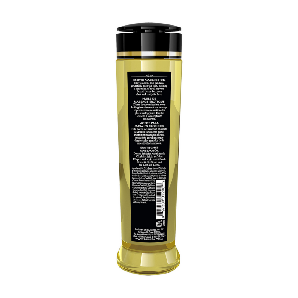 EROTIC MASSAGE OIL Sensuele geurige massageolie • Gemaakt van 100% natuurlijke koudgeperste oliën (emolliënten) • Geformuleerd met vitamine E • Geen vettige resten • Verstopte huidporiën worden niet veroorzaakt • Bevat geen minerale of dierlijke oliën Deze olie, gemaakt met bedwelmende geuren, glijdt gemakkelijk en soepel over de huid zonder een vettige residu achter te laten. Ideaal voor het geven of ontvangen van een ontspannende volledige lichaamsmassage. Deze massageolie is geparfumeerd met essentiële oliën en geuren en is daarom niet eetbaar. Vermijd contact met intieme gebieden. Niet aanbevolen als persoonlijk glijmiddel. Alleen voor uitwendig gebruik.