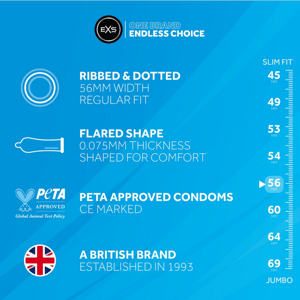 Geribbelde en gestippelde condooms van natuurlijke latex, uitlopende condooms met speenuiteinde en siliconengesmeerd condoomEXS Geribbelde en gestippelde condooms zijn 56 mm breed met een comfortabel uitlopend speenuiteinde. Dit EXS condoom is geribbeld en gestippeld voor extra stimulatie voor je partner. EXS geribbeld en gestippeld hebben geen latexgeur en zijn gemaakt van een dunne maar sterke zijdeachtige latex.EXS geribbelde en gestippelde condooms zijn uitvoerig getest volgens de Europese normen en door het British Standards Institute (BSI)