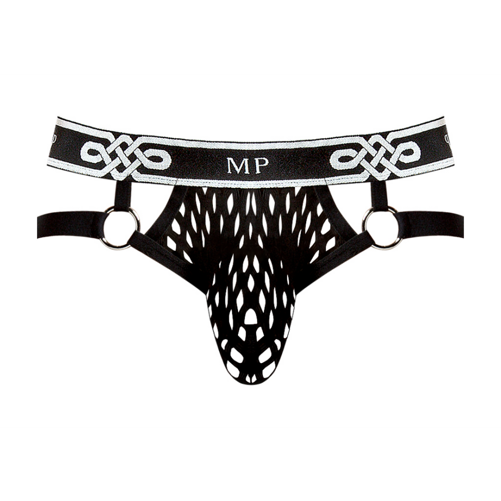 Van de Peep Show-collectie van Male Power, deze stijl omvat: Een jockstrap met zachte elastische beenbanden die zijn bevestigd aan decoratieve metalen ringen, en een zachte tailleband met het merk Male Power.