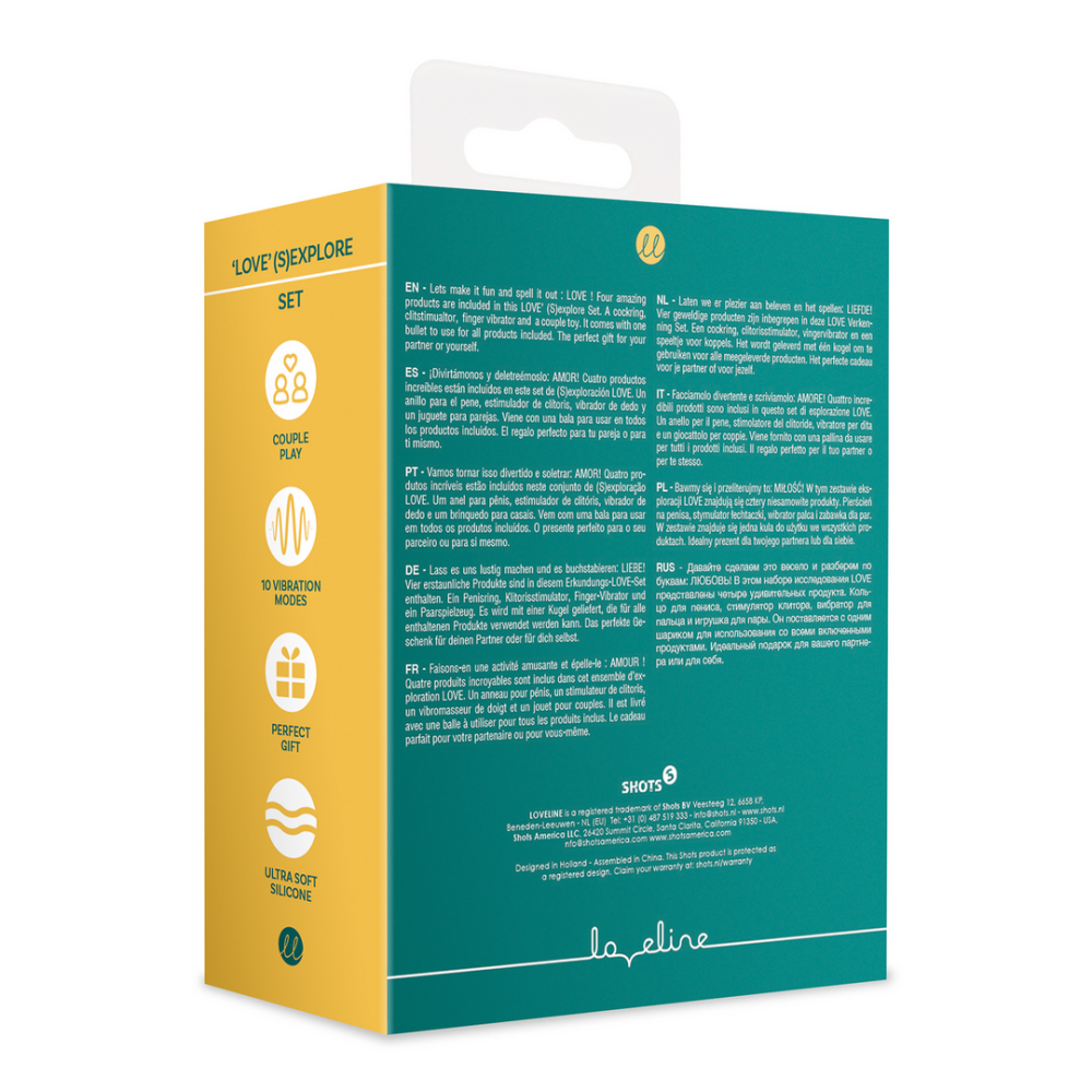 Laten we er plezier aan beleven en het spellen: LIEFDE! Vier geweldige producten zijn inbegrepen in deze LOVE Verkenning Set. Een cockring, clitorisstimulator, vingervibrator en een speeltje voor koppels. Het wordt geleverd met één kogel om te gebruiken voor alle meegeleverde producten. Het perfecte cadeau voor je partner of voor jezelf.