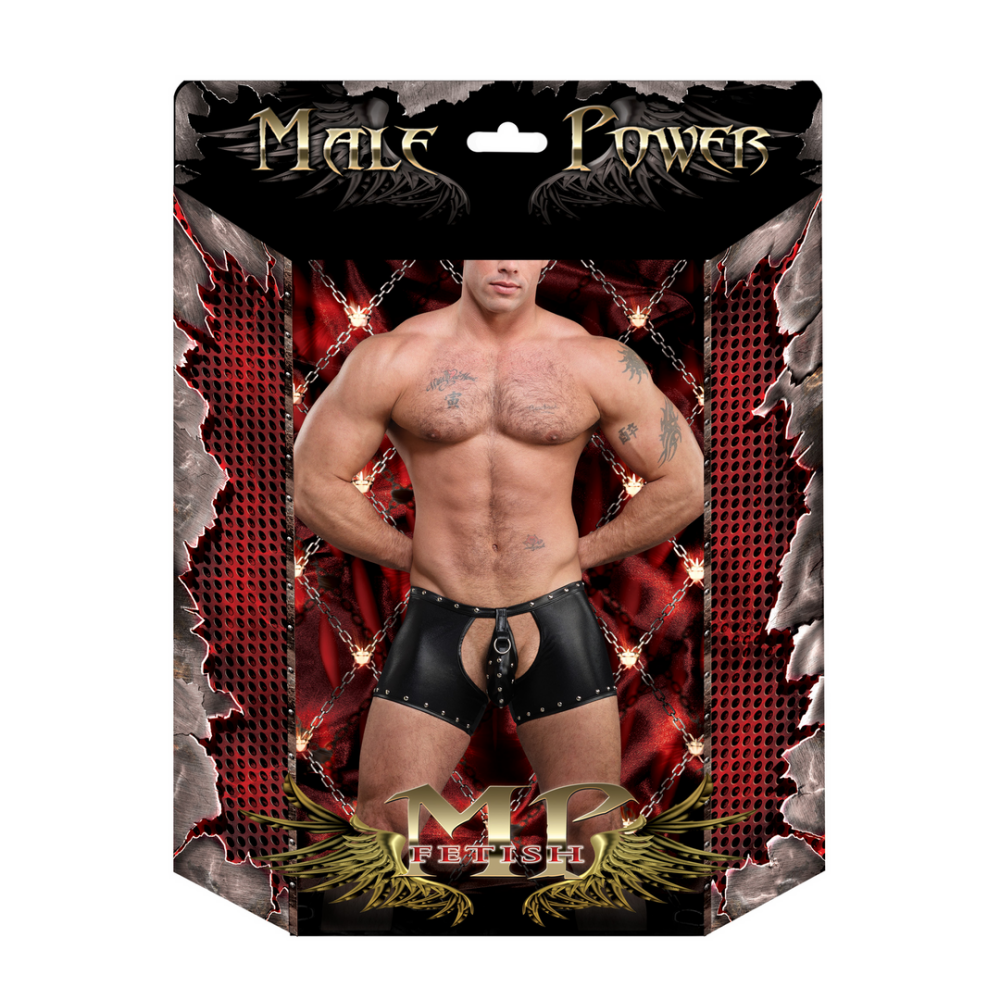 Van de Fetish-collectie van Male Power, deze stijl omvat: Chaps met een afneembare klittenband-string, decoratieve studs en een cire tailleband.