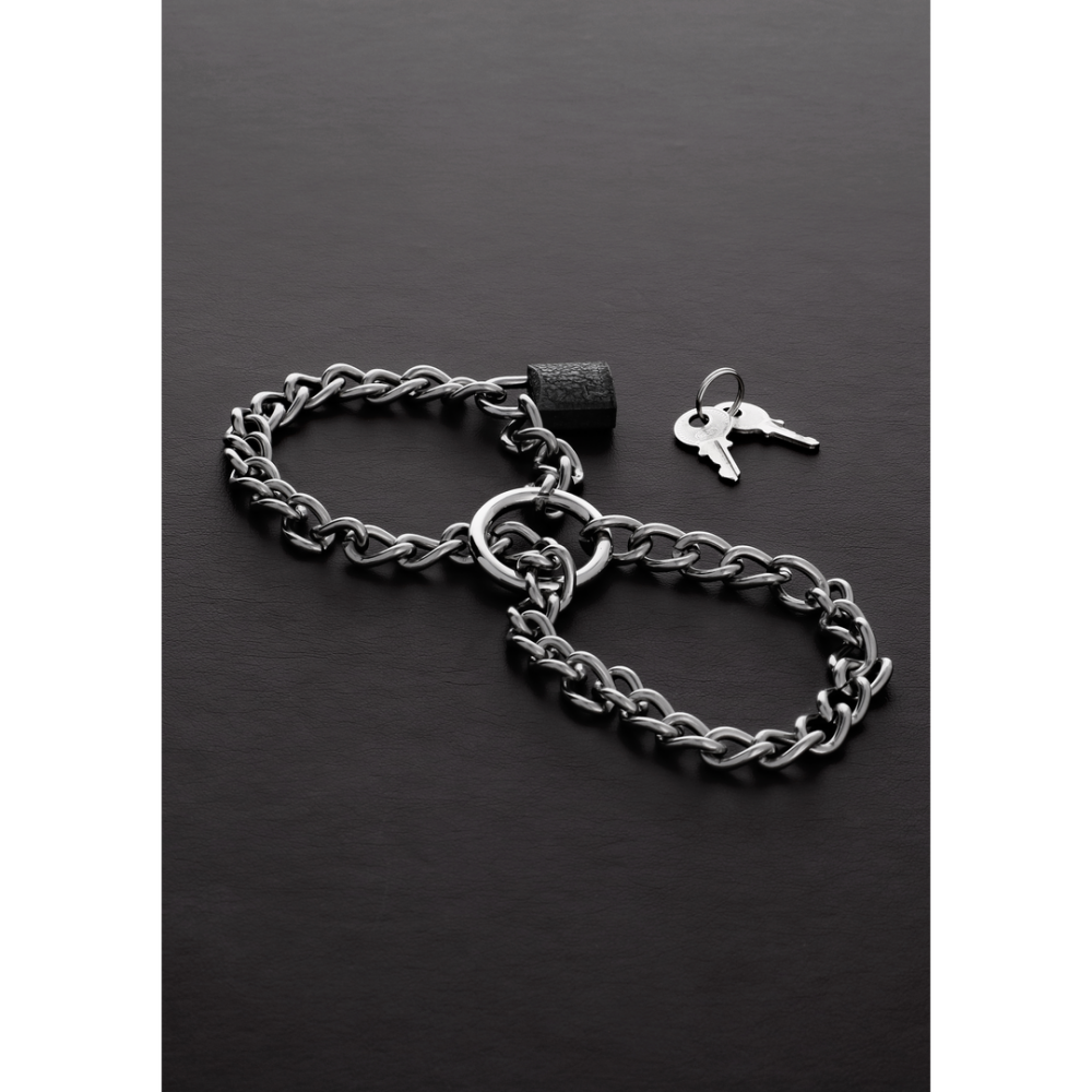 Zulke simpele kettinghandboeien. Door het smalle uiteinde van de ketting door beide grote ringen te draaien, kunt u twee lussen maken die de polsen (of enkels) nauw omringen. Daarna wordt de ketting beveiligd met behulp van een hangslot.