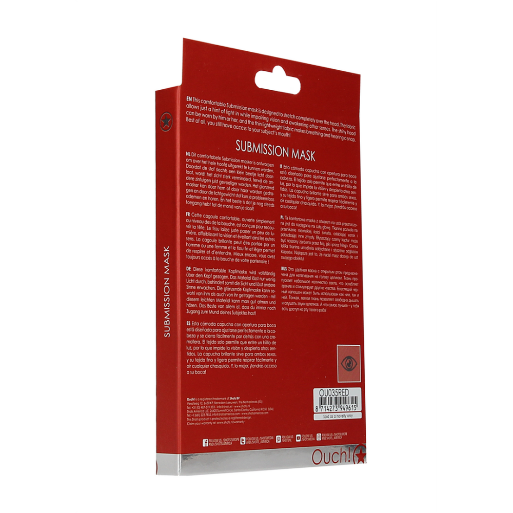 Dit comfortabele Submission masker is ontworpen om over het hele hoofd uitgerekt te kunnen worden. Doordat de stof slechts een klein beetje licht door- laat, wordt het zicht sterk verminderd, terwijl de an- dere zintuigen juist gevoeliger worden. Het glanzend masker kan door hem of door haar worden gedra- gen en door de lichtgewicht stof kun je probleemloos ademen en horen. En het beste is dat je nog steeds toegang hebt tot de mond van je slaaf!