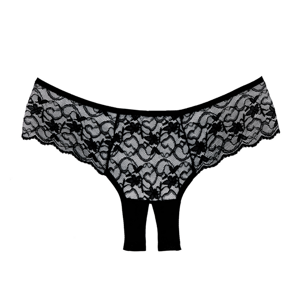 Een wervelwind van geschulpte kant bedekt je heupen en achterste in deze weelderige open kruis boy cut slip.