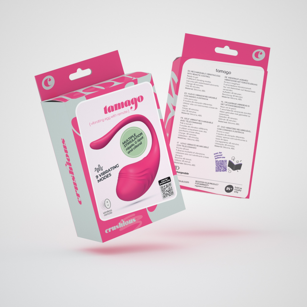Wie komt eerst? Jij of het eitje? Tamago vergezelt je overal, zet hem aan en breng hem in het vaginale kanaal. Geniet van de 9 beschikbare vibratiestanden en laat je partner ze bedienen.Bedien het eitje op het apparaat en op de draadloze afstandsbediening.Durf de afstandsbediening aan je geliefde te geven en ga voor onvergetelijke wandelingen!Je Tamago is waterdicht, gebruik hem onder de douche en in bad.USB-oplaadbare speeltjes zorgen ervoor dat je ze elke keer weer in hun volle kracht kunt gebruiken. Zorg ervoor dat de batterij is opgeladen voordat je gaat spelen. Het licht flikkert wanneer je de oplader aansluit om aan te geven dat de batterij wordt opgeladen. Als de batterij volledig is opgeladen, blijft het lampje branden. Volledig opladen gedurende 45 minuten. De eerste keer opladen duurt 2 uur.Gebruik je Tamago maximaal 45 minuten.De afstandsbediening werkt op één CR2023 3v batterij, meegeleverd.Bereik 10 tot 15 meter in open ruimtesGebruik:Druk 2 seconden op de knop op het ei om in te schakelen. Pas het ei aan je anatomie aan met de staart gericht op je clitoris. Dit apparaat is niet geschikt voor anaal gebruik.Druk op de vibratieknop op de afstandsbediening om te schakelen tussen 9 standen.Om de vibratie te pauzeren, druk je 2x op de vibratieknop op de afstandsbediening.Om de vibratie te hervatten, druk je nogmaals op de vibratieknop op de afstandsbediening.Om hem uit te schakelen, druk je 2 seconden op de aan/uit-knop op de afstandsbediening of op de vibratorbasis. Het lampje gaat uit.Verwijder de batterij als je hem niet gebruikt.Maak de afstandsbediening niet nat, veeg hem af met een vochtige doek als dat nodig is.Schoonmaken gaat in een handomdraai, was het eitje met lauw water en neutrale zeep of gebruik een reinigingsspray voor speelgoed. Klop het droog en bewaar het uit de buurt van licht- en warmtebronnen.Het gebruik van glijmiddel wordt aangeraden voor een betere ervaring. Gebruik altijd glijmiddel op waterbasis. Oliën en andere soorten glijmiddelen beschadigen de integriteit van het materiaal.Crushious glijmiddelen zijn de beste aanvulling op je Crushious speeltjes.Afmetingen: 9 cm inbrengbare lengte 3,6 cm in diameter.Materiaal: ABS, Silicone.