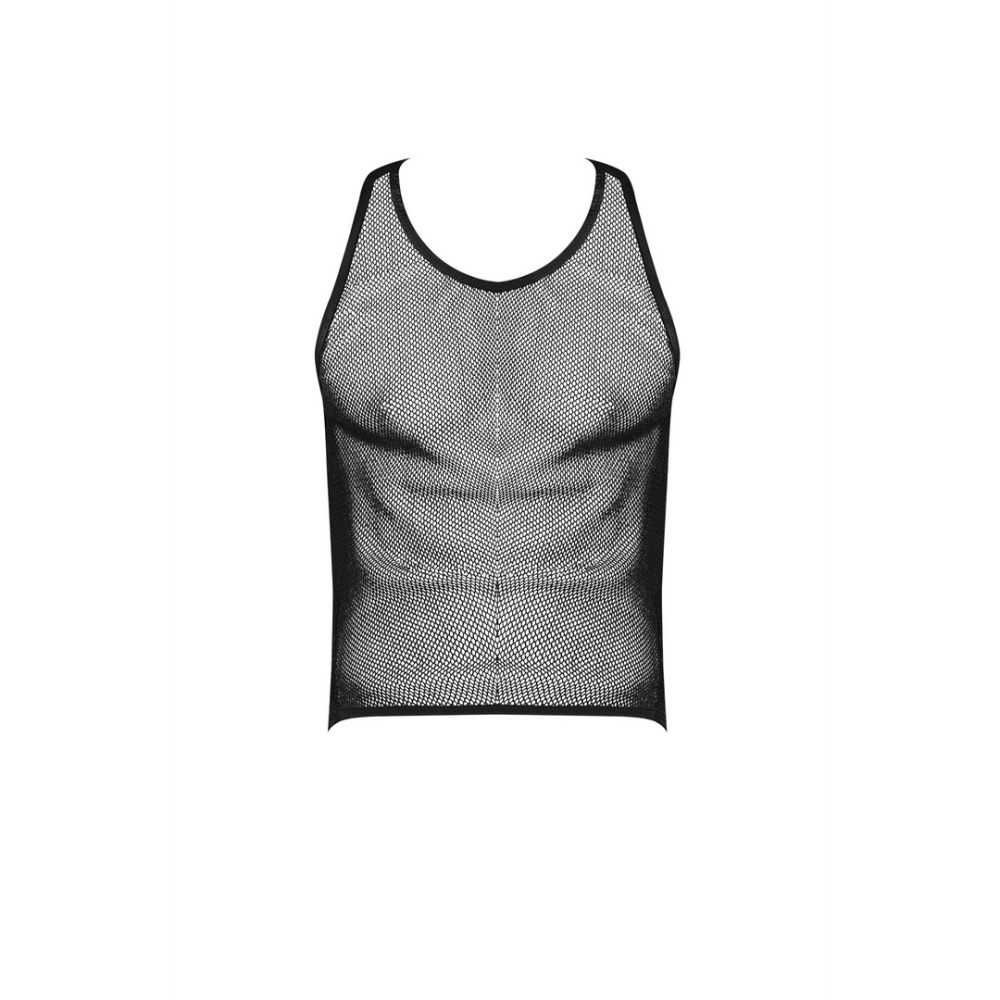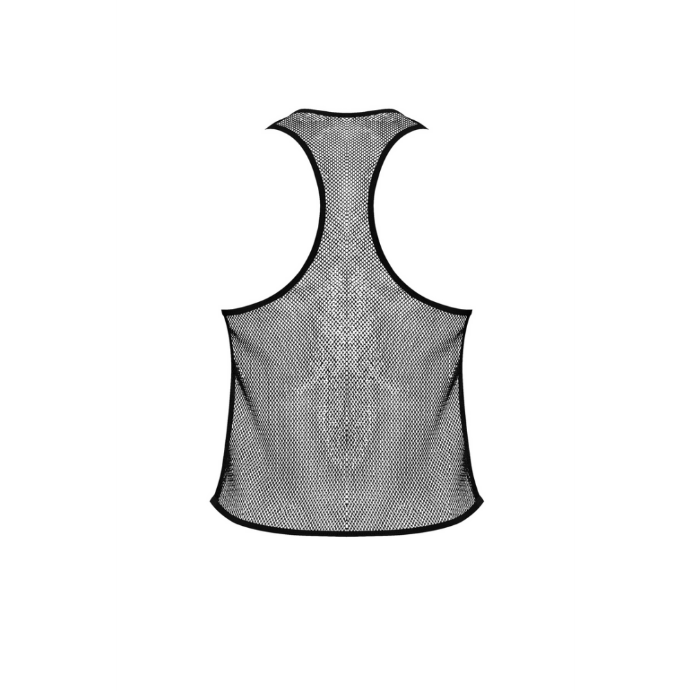 Van de Stretch Net-collectie van Male Power, deze stijl omvat: Een stretch visnet tank met een racer-back en zachte, bijpassende elastische afwerking.