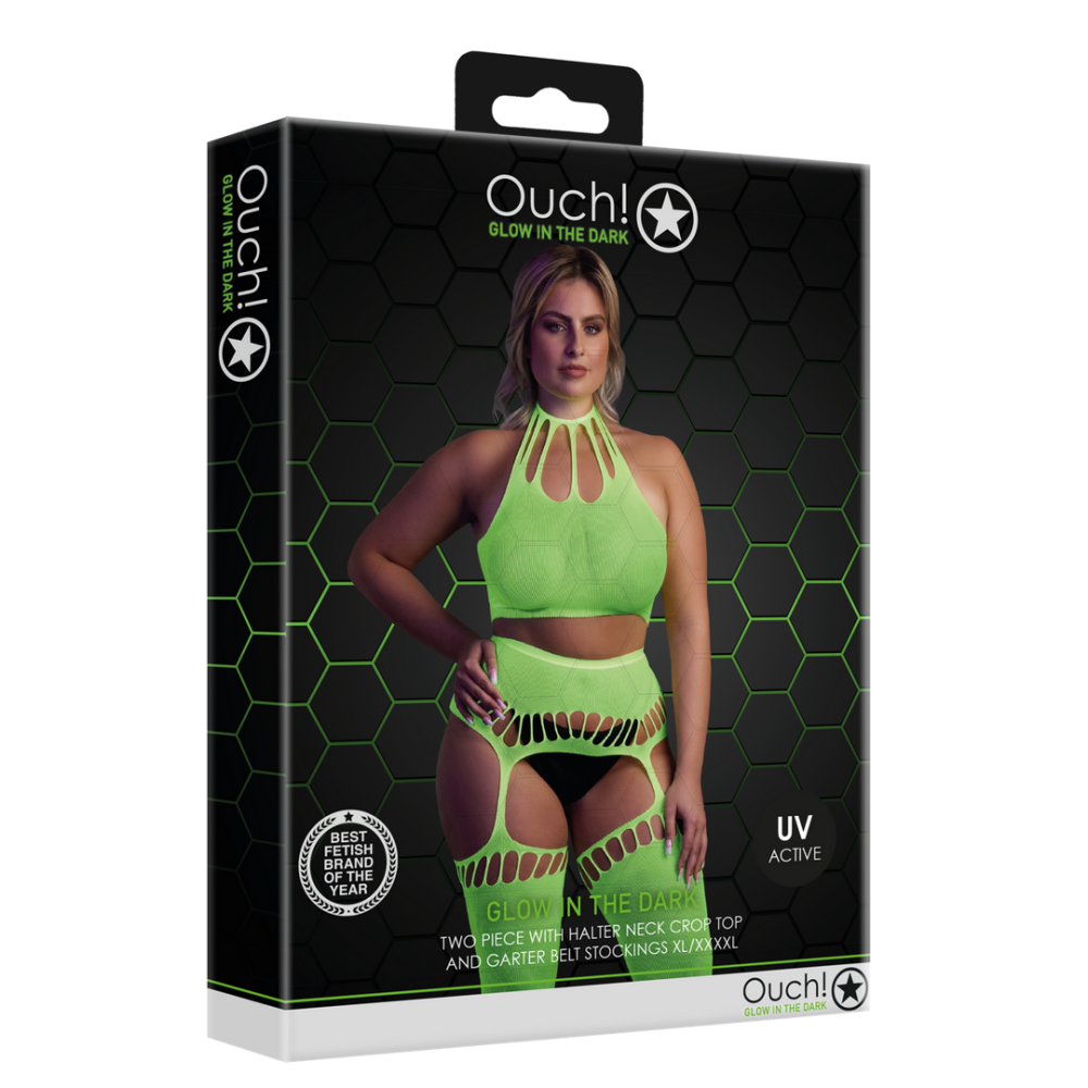 Our Neon lingerie is the perfect addition to your collection. Made with comfortable, easytofit, stretchy materials they are designed to fit your body perfectly. Whether you’re using them as party wear or as lingerie, this eye-catching piece will make sure you stand out! Unleash your inner goddess with this stunning UV activated lingerie. This piece consist of a halter neck crop top and garter belt stockings. An amazing party-wear that gives you that wow-factor and makes you stand out. The UV activated materials adds a touch of mystery and allure. Easy to fit because of the stretchy materials will make you light up the night. Available in neon pink and neon green. Sizes run from XS/ XL to XL/XXXXL