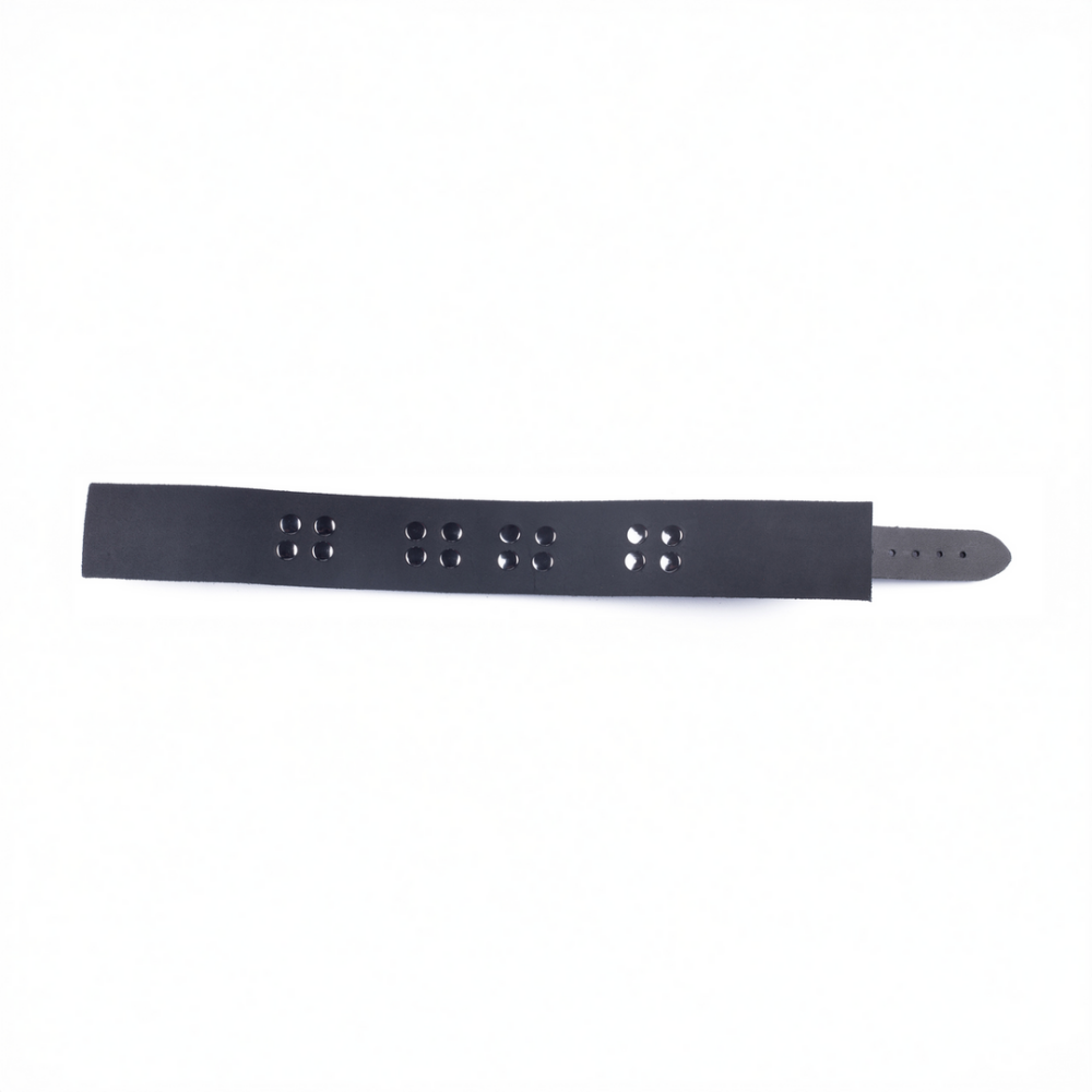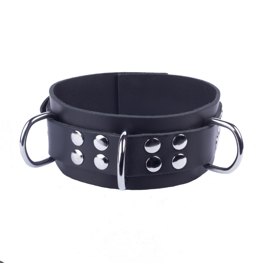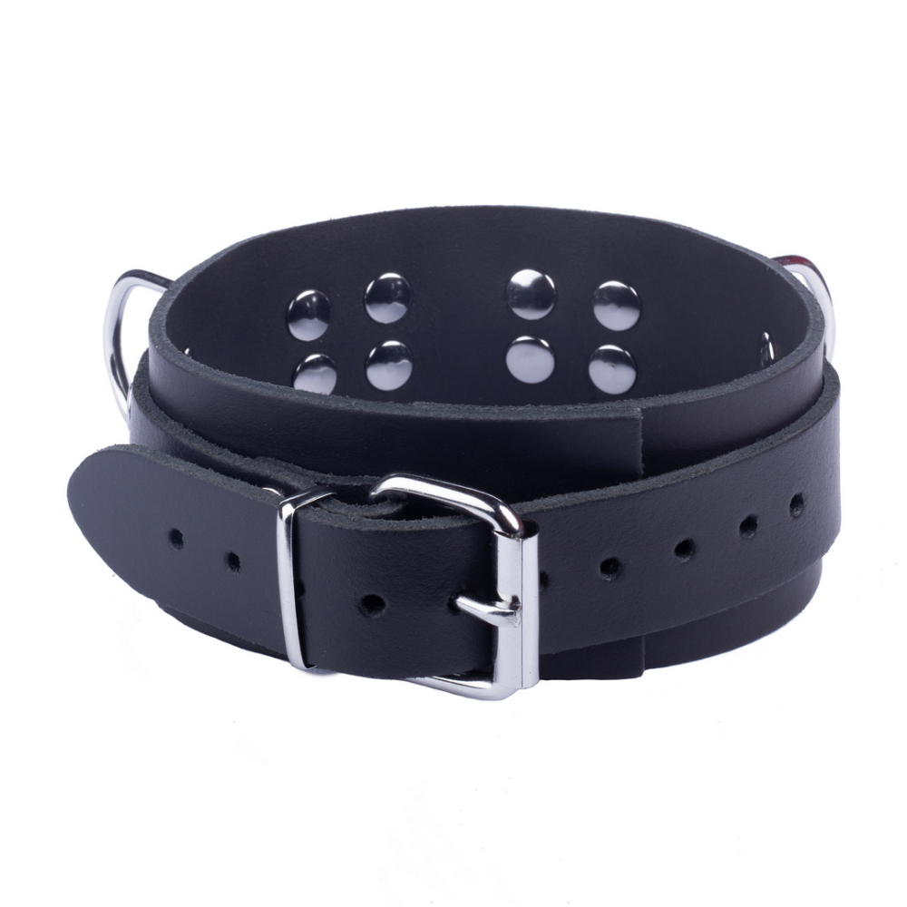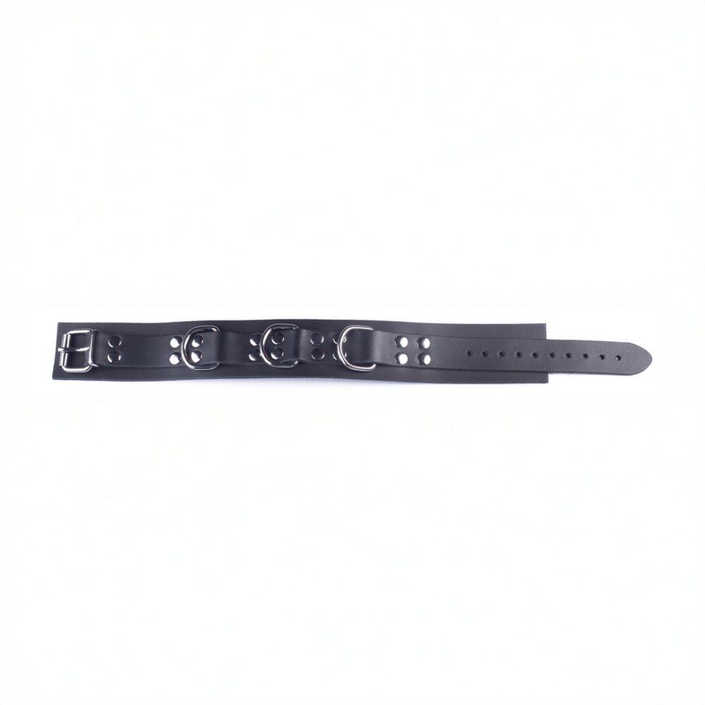 The leather necklace from the Ultra range is the perfect accessory to make style even more SM. It has a width of 5.5 cm and a neck size ranging from 38 to 52 cm. Fasteners, rivets and rings are metal. Genuine cowhide leather. Vegetable tanned. Made in Europe.