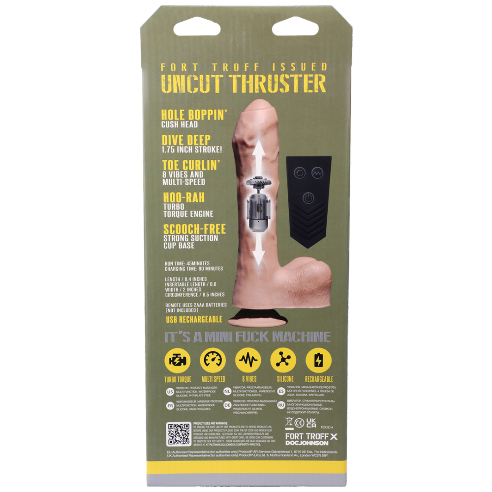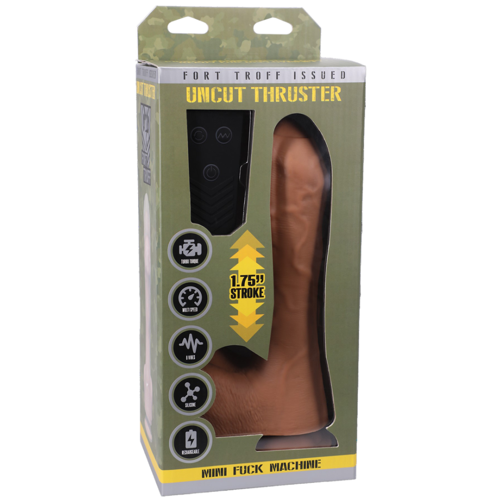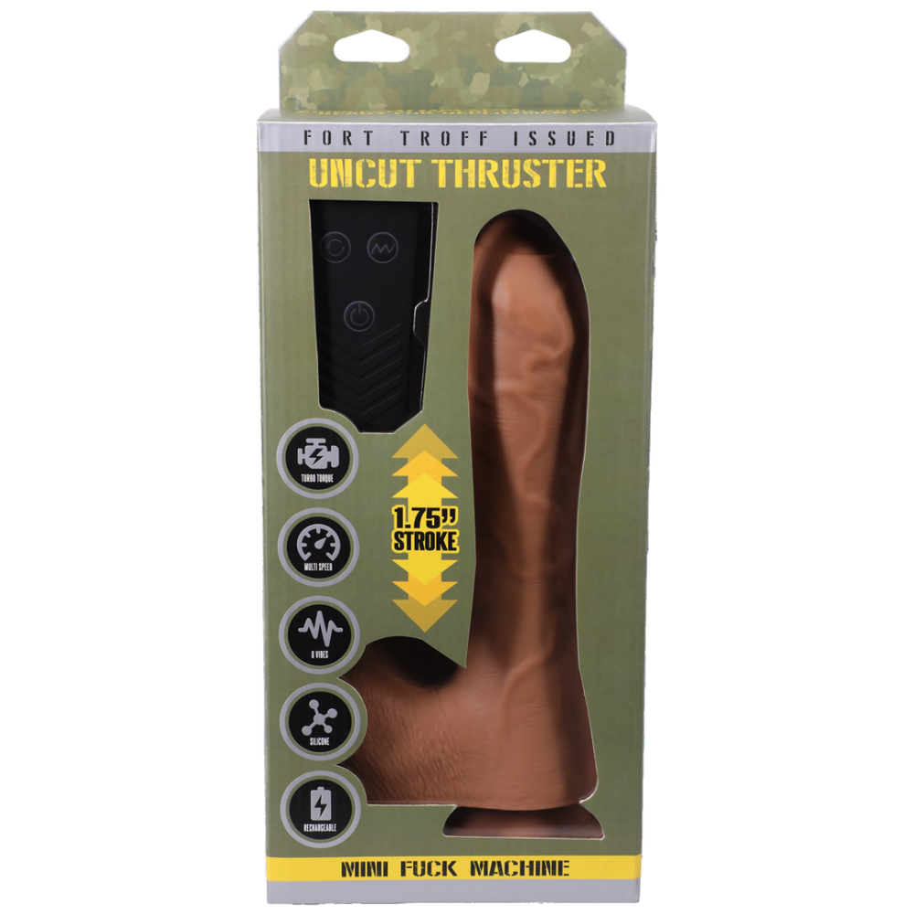 Met de Uncut Thruster draait alles om de heen-en-weer slag voor het echte gevoel van een harde klap, uncut Top. Met een slag van net onder de 2 inches, komt deze thruster bijna overeen met de slag van grote fuckmachines. De supercharged motoren van de Uncut Thruster leveren de kracht om diep door te dringen. We hebben ervoor gezorgd dat het sterk genoeg is om de strakste gaten te penetreren. De paddenstoelvormige kop is superzacht en comfortabel, voor EZ entry. Deze power top controleren is eenvoudig… gebruik de afstandsbediening of de knoppen op de ballen. Je hebt 2 snelheden van fuckin’, die iets snellere versies van de basis slag bieden. In tegenstelling tot traditionele fuckmachines biedt de onze ook 8 vibratie-instellingen. Aangedreven door een state-of-the-art lithiumbatterij, is de looptijd ongeveer 45 minuten. USB oplaadbaar, en het duurt ongeveer 1,5 uur om op te laden. Gemaakt van Premium Liquid Silicone, zodat je elke lub kunt gebruiken. Hoewel de Uncut Thruster niet fluisterstil is, vonden we dat een motor met een beetje gedruis essentieel was om de stoten te leveren waar piggy holes naar verlangen.