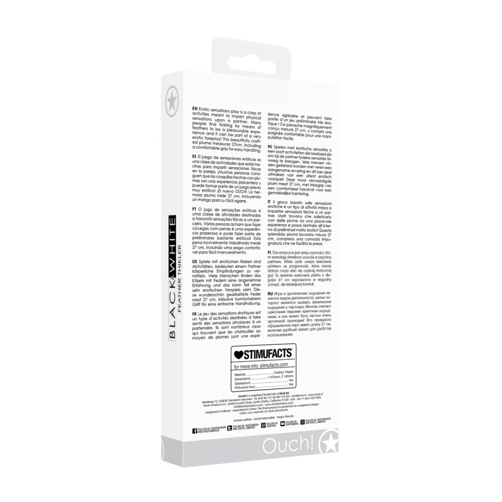 Spelen met erotische sensaties is een soort activiteiten die bedoeld zijn om bij de partner fysieke sensaties teweeg te brengen. Vele mensen vinden gekieteld worden met veren een aangename ervaring en dit kan deel uitmaken van een uiterst erotisch voorspel! De nieuwe OUCH!- veer bevindt zich in een klasse apart en zal al jouw zintuigen prikkelen voor een onvergetelijke ervaring! Deze mooi vervaardigde pluim meet 27 cm, met inbegrip van een comfortabel handvat voor een gemakkelijke hantering.