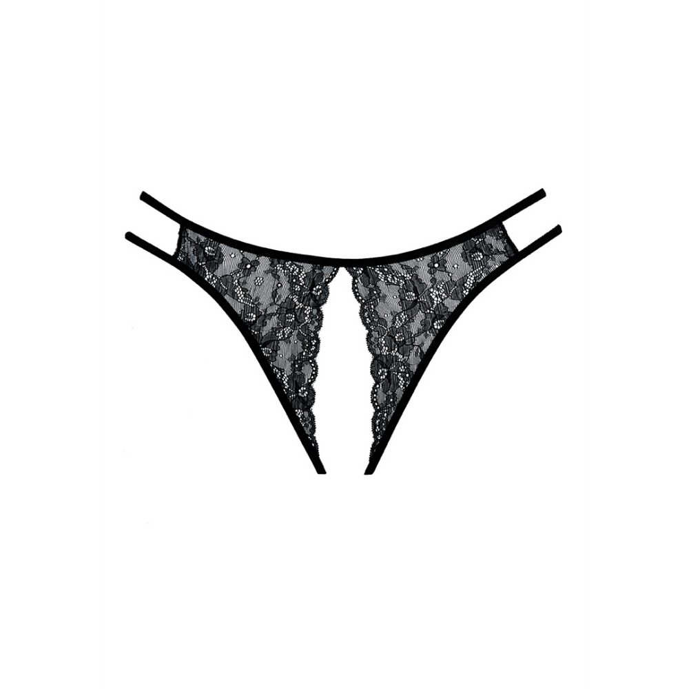 Verleidelijk zoet, geschulpte kant strekt zich op een spannende manier over de voorkant uit en laat een piepklein openingetje zien. Dubbele dunne bandjes raken de heupen met een zeer ondeugende snit van doorschijnend gaas aan de achterkant.